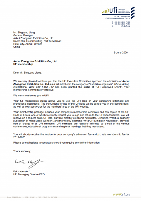 2020年6月9日,UFI(全球展覽業(yè)協(xié)會(huì))巴黎總部傳來喜訊:中法合資高博中貿(mào)會(huì)展在山東、江蘇、安徽主辦的CNFE全國食品博覽會(huì)(濟(jì)南)、CNWFF中國(南京)···